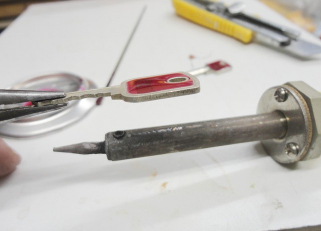 Veja como fica mais uniforme depois de esquentar um pouco. Veja que a cola não ultrapassou o limite do canal em baixo relevo na chave. Isso é interessante porque se deixar passar até a borda, a cola pode lascar ou soltar com o tempo. Dessa forma ela não tem como soltar com facilidade.
