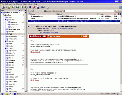 E não é que a UOL arrumou um jeito prático de “combater” o SPAM, fazendo mais SPAM? Sim, obras de algum cérebro de ervilha lá dentro, inventou essa do “tira-teima” Uma meleca que obriga você a entrar em uma página fedorenta da uol e confirmar que o seu e-mail que esta indo para um usuário UOL, que imbecilmente ligou o filtro.